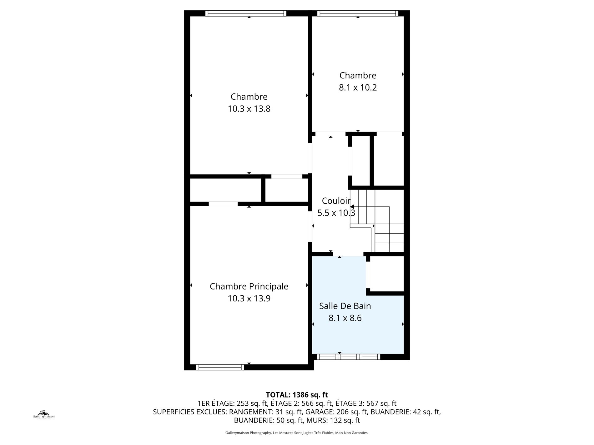 | Salle de bains | 8.1 x 8.6 P | 2ième étage | Céramique |